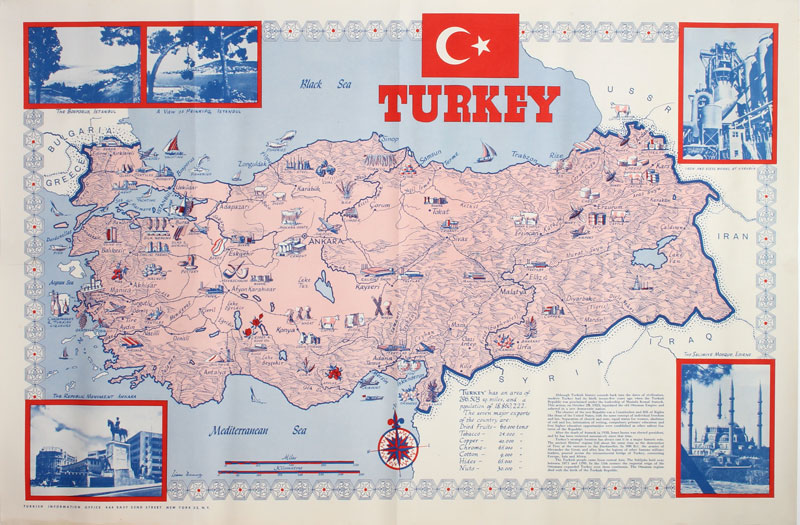 Original vintage Turkish poster issued by the Turkish Information Office in New York in the 1940's. The poster depicts a map of Turkey and description of the demographics of Turkey. The text you can read that the population is 18,860,222 which would be a number from post WWII.