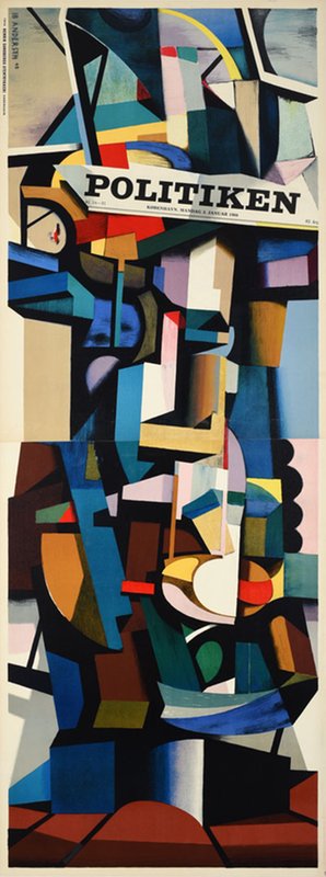 Ib Andersen designed this striking poster in 1965 to advertise the Danish Newspaper Politiken, and it features a charming cubism style. The poster is a stone lithograph printed in sixteen colors and spans across two sheets.