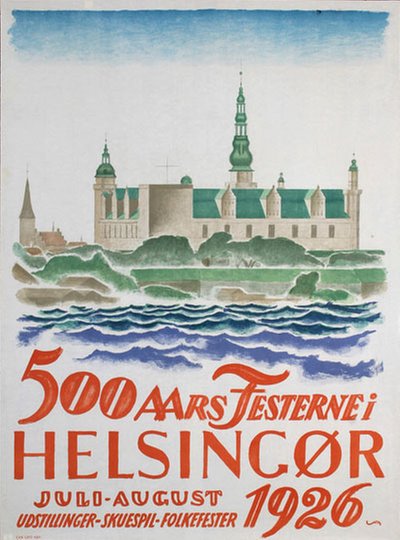 This is an exquisite original vintage poster created to commemorate the 500th anniversary of the city of Elsinore in Denmark. Elsinore, known for its iconic Kronburg Castle, famously featured in Shakespeare's play Hamlet. To honor this historic milestone, the town organized Shakespearean performances within the castle.