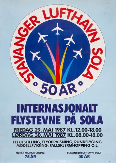 This genuine poster from 1987 commemorates the 50th anniversary of Stavanger Lufthavn Sola, an international air show. The poster highlights a variety of aviation activities, such as flight exhibitions, aerial displays, sightseeing flights, model flying, and parachuting, along with a special focus on Norwegian military aviation.