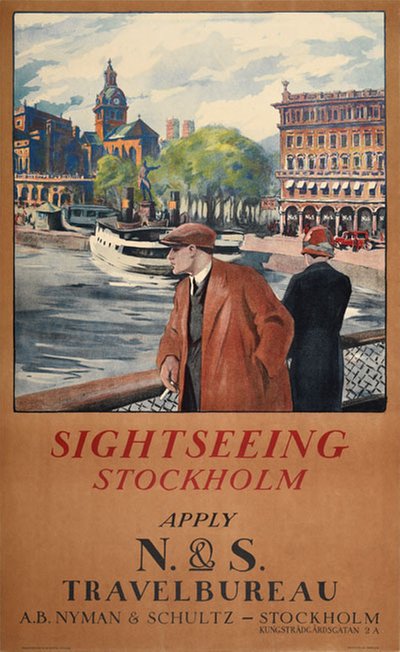 Presenting a remarkable original vintage poster, it was originally issued by the esteemed travel agency, A. B. Nyman & Schultz, to entice travelers to explore the captivating sights of Stockholm, Sweden.