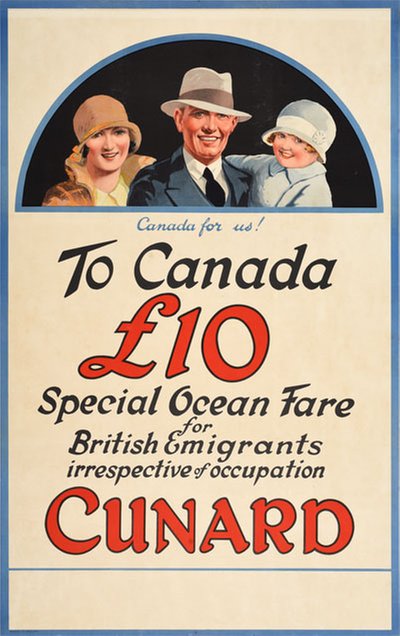 This is a wonderful and original vintage poster issued by Cunard, likely from the late 1920s, promoting special ocean fares for British emigrants. The text reads: "Canada for us! To Canada £10 Special Ocean Fare for British Emigrants irrespective of occupation - CUNARD."