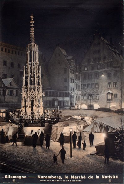 This is an authentic vintage travel poster promoting Nuremberg's Christmas Market (Marché de la Nativité) in Germany.